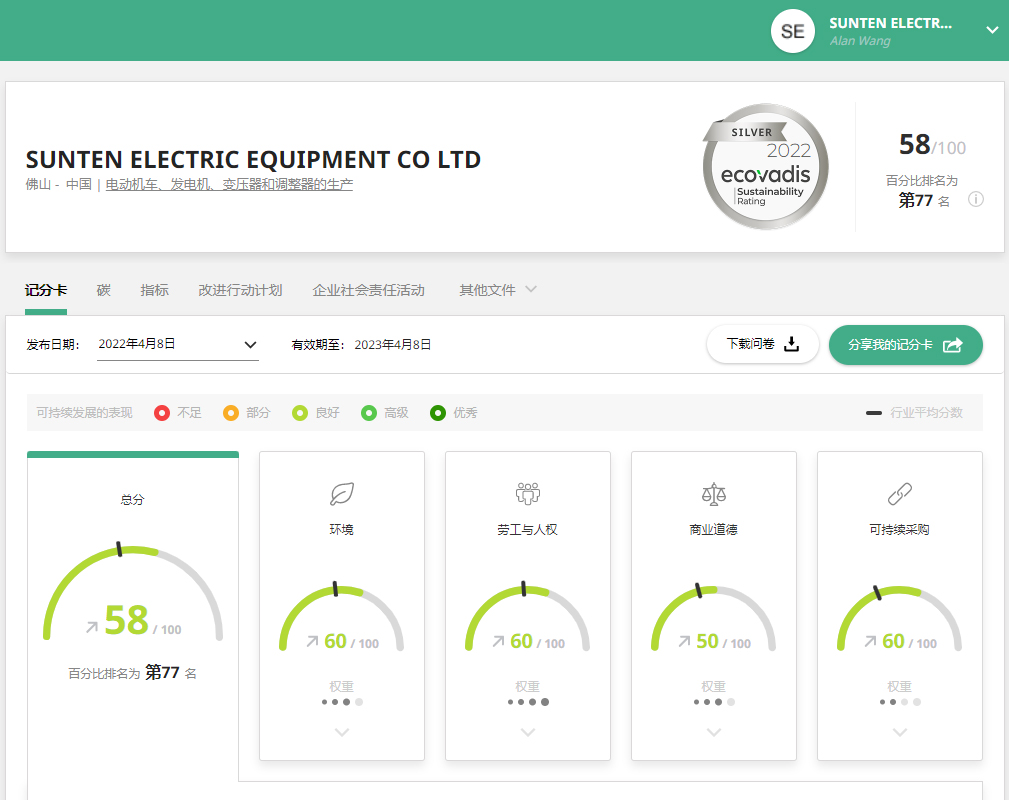 在各部門的共同努力下,3月22日,項目工作組把全部資料按要求提交,正式上傳EcoVadis平臺。4月8日,工作組查詢EcoVadis平臺的評審結(jié)果,公司獲得58分(銀牌)的好成績!